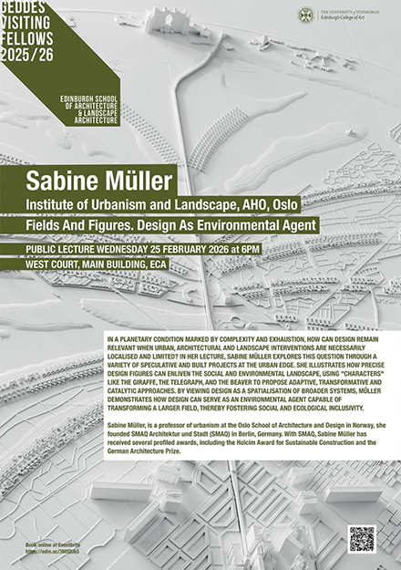 Sabine Müller, Geddes Visiting Fellow 2025/26 at the Edinburgh School of Architecture and Landscape Architecture (ESALA), will give a public lecture entitled ‘Fields and Figures: Design as Environmental Agent’ at the University of Edinburgh’s College of Arts.